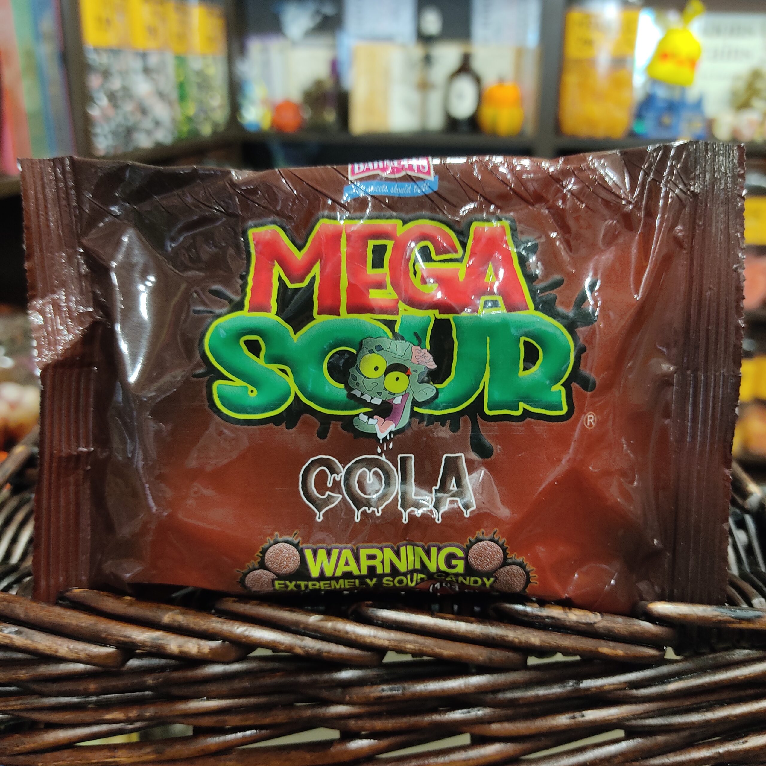 Un bonbon dur parfum cola, couvert d’acide citrique avec un coeur effervescent. Langue sensible, s’abstenir ! Les méga-acides, ou « mega sour », viennent tout droit d’Angleterre.