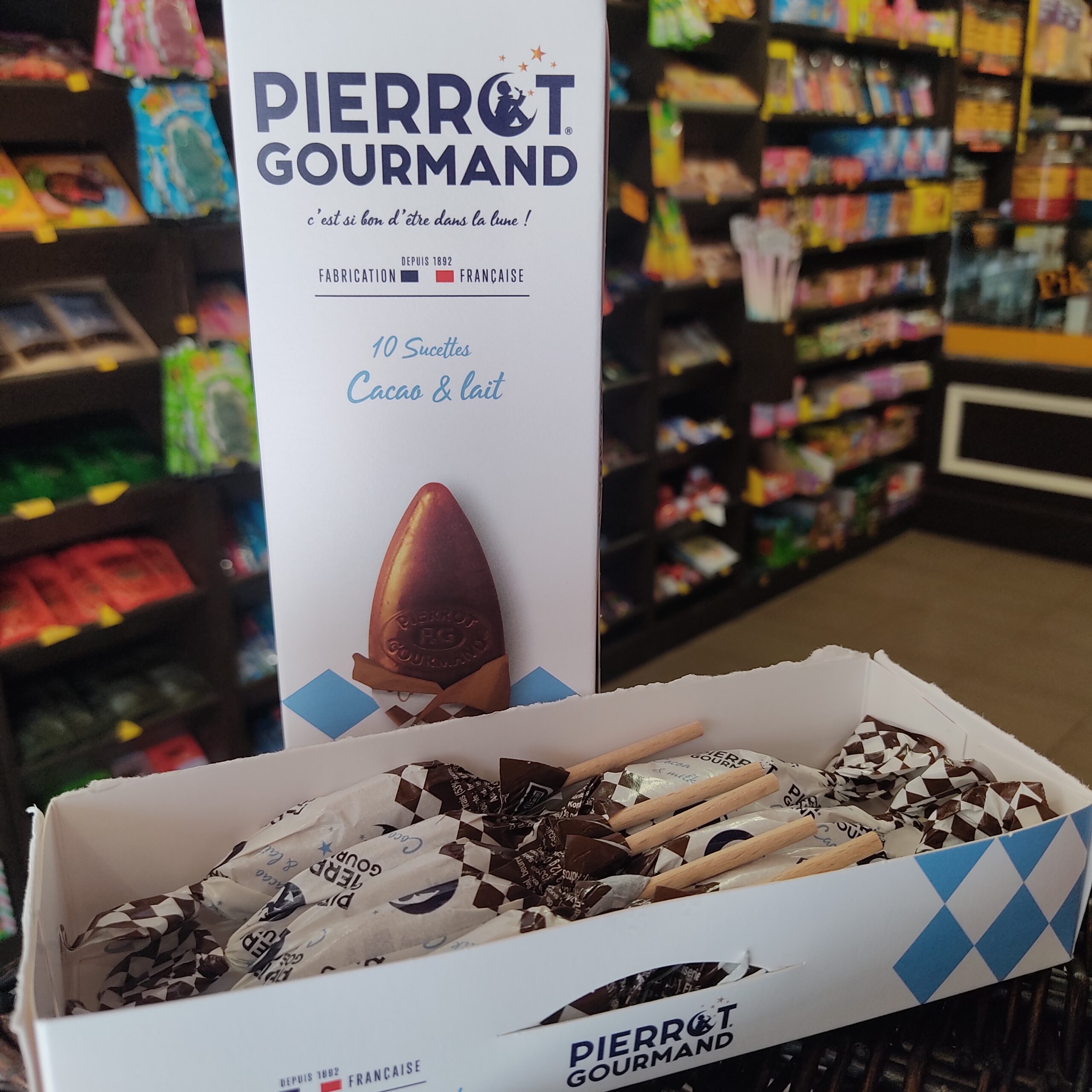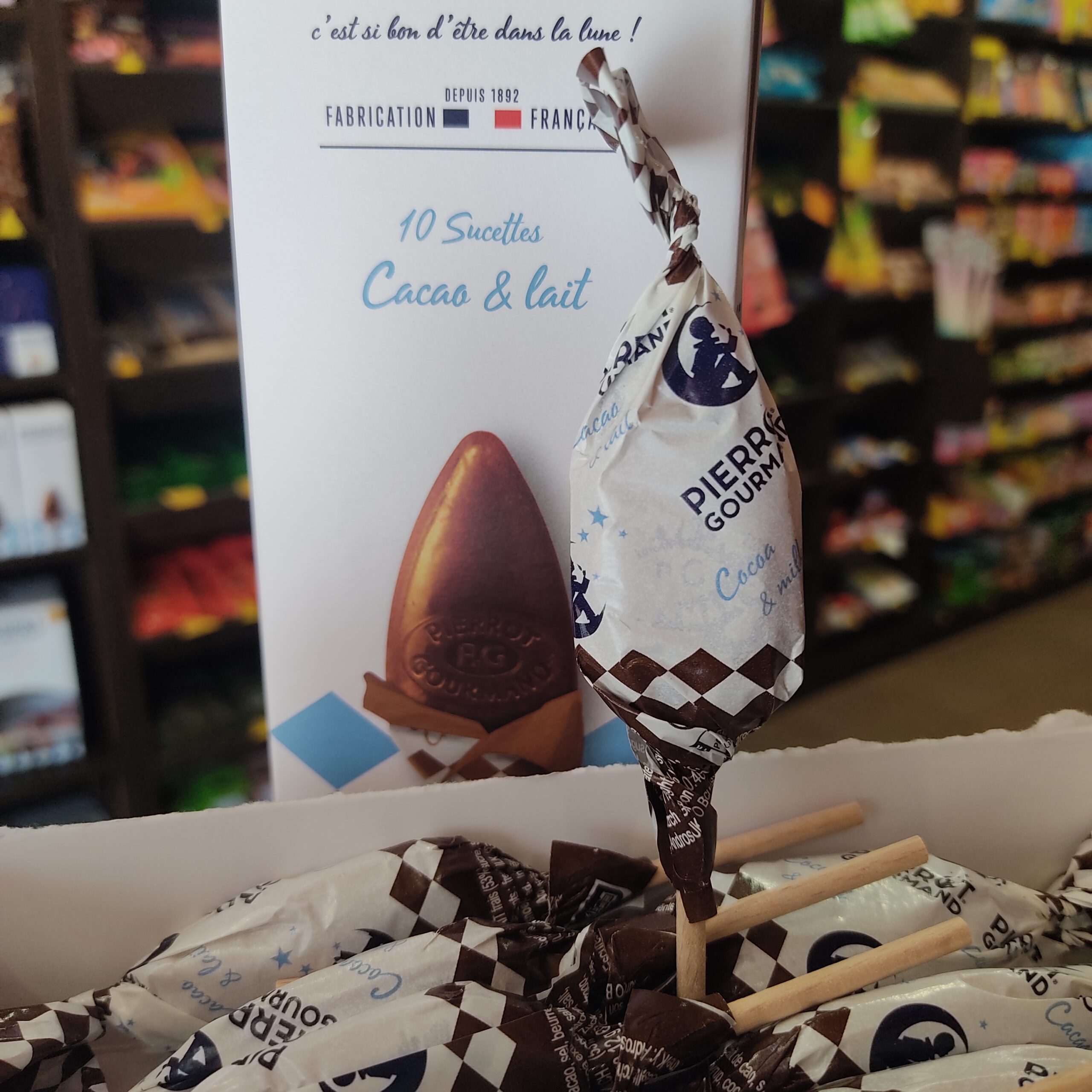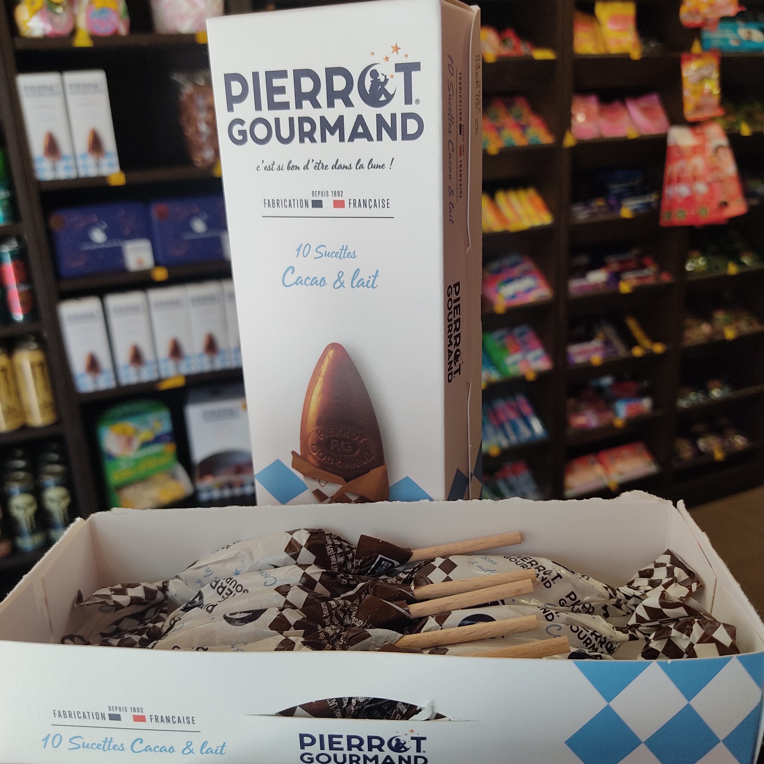 > PRODUIT : UNE BOÎTE DE 10 SUCETTES PIERROT GOURMAND CACAO ET LAIT